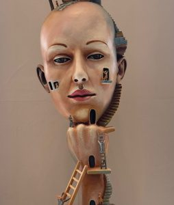 The meandering ladder that cross from right to left in the brain carries the messenger angels from earth to the heavenly heights. Busmantis’s sculpture captures the stages of change, the rootedness, the celebration, the pausing to consider and the congruence of Jacob’s dream sequence. Resting an inspired head on a fistful of promises (rings, nail, blisters and even age) turns the nightmare of living into a dream. There is the quiet promise that morning brings. As sister Winters put it, “hope is the promise of morning.”