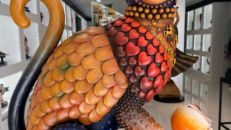 Between the art of Busmanti and the graphics on every building’s blank canvas, rejuvenation is the cat’s meow. The fingered paw clutches the fruit. The garland of hearts embraces the forever future. The shield of armor protects more than a delicate underbelly. The rings of beads frame the ladder laden head so the eyes stare past the moment into the journey, knowing that the unknown will scratch the surface to the known.