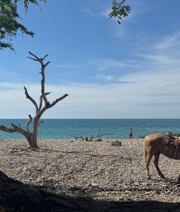 The denuded tree, just above the tide-line, is witness to populations of birds in times gone by.  The horse a remnant of more traditional trails.  The sky a constant parabola for sun. Scanning the horizon there is hope embedded in the spinning planets, suns, moons and daily tides.  In the midst of winter (as Albert Camus puts it)I found within me an incredible summer. Escaping winter to find summer warmth is not a metaphysical posture. Yet it hints that at the locus of transition there is a path of points that pave the way. There is research that shoulders natural vitamin D and more studies that support changes of routine however the very presence of sun seekers testifies to a desire for change.