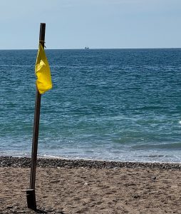 Traditionally at the end of day a bugle would play “The Last Post” signifying the end of a day’s activities.  The composer, like so many nights, is lost to history. Tonight it simply is a moment of reverie at the end of a sojourn to celebrate blessed goodness and savour every great feast.  At the tide line the yellow flag warns of a moderate hazard.  An undertow, some strong currents and moderate surf.  Overlooking the water at end of day the calm is deceiving. The kind of trickery that local sidewalks play.  Things look ok but every step or stroke is challenged by ever changing conditions.