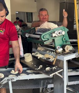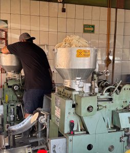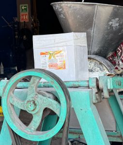 Down the road closer to town a larger plant was producing more tostados with bigger machines and fewer people. The noise level was louder and the safety of the workers at risk. The unshrouded drive belts coupled with three belts to the 5 HP motor was exposed to hands, fingers, aprons and arms! The ingenuity of mechanization and the focus on tradition becomes essential to supporting the growing tourist demand. Produced by hand in daily batches as they are at the Santa Fe Hotel in Puerto Escondido might be safer — but is also an acknowledgement of the traditional art.