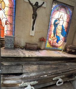 Why do you seek the living among the dead? Corroding casket handles and caving roofs dust the burial site with an earth to earth sense. What could possibly breathe new life into this dust. Why focus on some hocus pocus distraction? Could it be that in the words of Eliot, “in my beginning is my end” have been inverted. Through the stained glass window rays of light. A crossed up Jesus hanging in the shadows of a crypt. This is not “Crypt Currency!” This monumental attention that our living has placed on dying might be an escape. Could it be that living is all we know? Living and enjoying life. Community is all we have. Living for others is all that matters. Knock, knock who’s there?