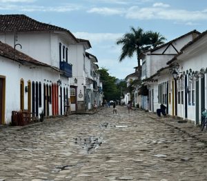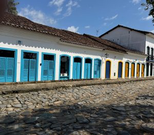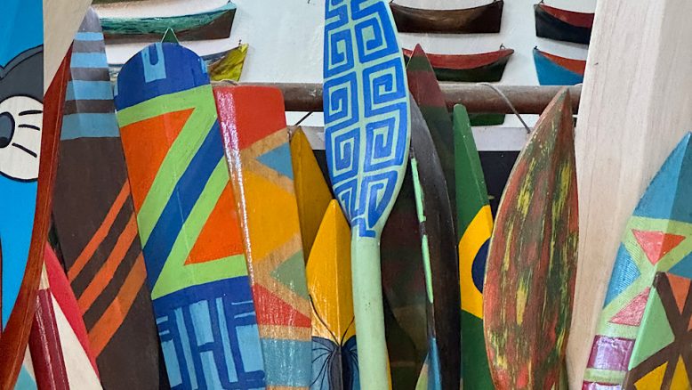 Paint dazzled paddles flash a cultural richness into a woodworking studio. The rush for gold blazed a highway through the forest in record time. The rush for gold buried construction crews along the highway. Taxes and Imperial fees buried the new highway leaving Paraty as a heritage site and its rich cultural history in a barrel of painted paddles.