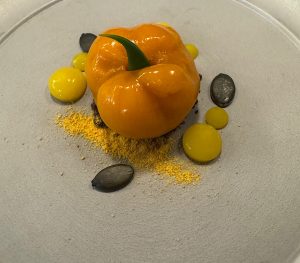 The traditional art is reflected in the chef’s rending of an edible miniature pumpkin created using an edible pea tip as a stem!